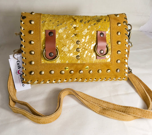 Bolso artesanal de cuero natural en tono mostaza con detalles dorados