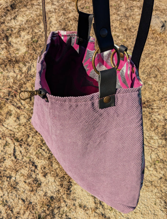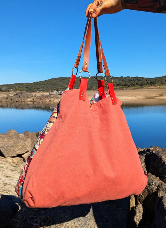 Bolso artesanal en piel con salpicaduras doradas y marco fucsia